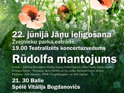 22.jūnijā pl. 19:00 Zvejnieku parkā Jāņu ielīgošanas pasākums. Jau 9. reizi Salacgrīvā Jāņus ielīgo ar kādas populāras latviešu kinofilmas dramatizējumu, šogad – ,,Rūdolfa mantojums”. Šajā izrādē lomās iejūtas dažādu profesiju pārstāvji kuriem ikdienā ar teātri nav nekādas saistības. Lomās – Katrīna Borozdina, Vineta Dance, Evita Liepiņa, Velta Ozola, Sanita Kānīte, Kristaps Soms – Tiesnesis, Jānis […]